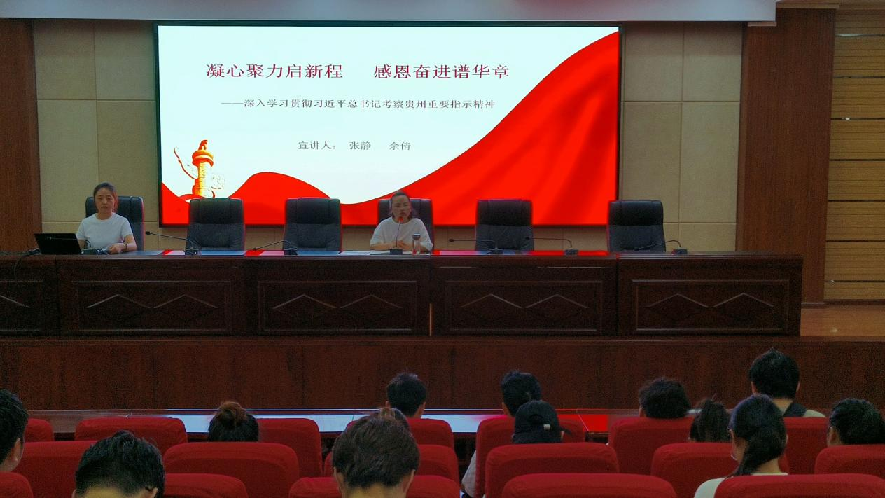 6月16日,公司举办习近平总书记考察贵州重要讲话精神专题宣讲活动,商公司党委副书记张静与辅导员佘倩以联合宣讲的形式,为全院员工深入解读讲话精神内涵,结合商科特色,从专业视角展现贵州在高质量发展、文化传承、城乡融合等领域的实践成果,引导员工将个人发展融入区域发展大局。