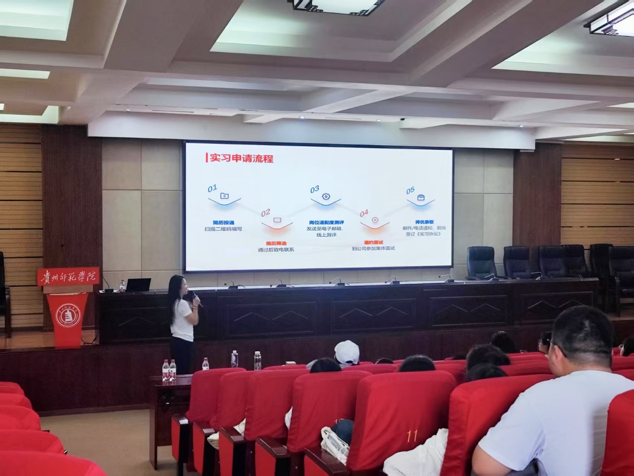 随后周承博紧扣同学们的诉求,系统介绍企业优势。公司注册资本24.07亿元,股东背景雄厚、投资布局完善,目前已构建由7家中心支公司组成的服务网络,规模实力强劲;公司从基层至高层员工年龄结构合理,通过“岗前培训—职业化塑造—管理知识赋能”三级培养体系,为员工提供全周期成长支持,明确员工待遇、职业发展路径;同时,公司推出 “小海豚计划”(人才培养计划)等服务举措,全方位为人才搭建职业发展桥梁。最后富德生命人寿保险股份有限公司贵州分公司人力资源部经理王媛介绍实习和就业岗位申请流程以及简历投递注意事项。